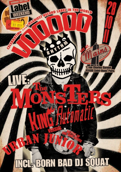 Voodoo Rhythm Label NightVenue: Mains d'Oeuvres1, rue Charles Garnier 93400 Saint-Ouen, Paris Friday 28th October 2011 Voodoo Rhythm Labelnight & a Born Bad night Line Up: THE MONSTERS1986 Bern, Switzerland THE MONSTERS where formed. In September this year their new album POP UP YOUR (8th full length)is born. It started as a mixture of ROCKABILLY and GARAGE PUNK, the Monsters transformed themself into real Trash-Monsters. The music is strapped down to the minimum. Only one guitar, bass and TWO DRUMS that's the Monsters. Ultra simple lyrics most time just one line for a song, that's enough and with the power of a jumbo jet they get in your ears and destroy your brain in no time.